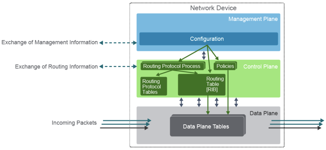 Netzwerk Geräte können grundsätzlich in ihrer Arbeitsweise, wie sie Datenpakete verarbeiten, in drei Schichten (Planes) unterteilt werden. In der Regel ist betrifft der Hauptteil der Datenpakete nur der die Data Plane und nur wenige Pakete die Management oder Control Plane.