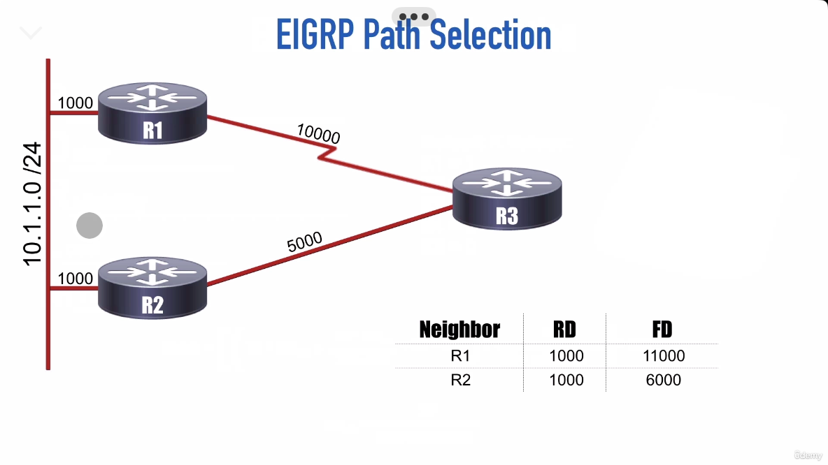 Wenn EIGRP nun entscheiden soll, welche Route zum Ziel genommen werden soll, dann wird auf Grundlage der Reported Distance die Feasible Distance berechnet.